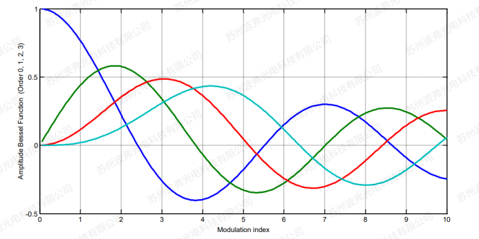其輸出光譜服從貝塞爾函數分布,如下圖,藍色代表載波,其他依次為±1±2±3階邊帶,輸出光譜強度隨調制深度的變化(Modulation index),此調制深度也可等效理解為調制器的驅動電壓。
