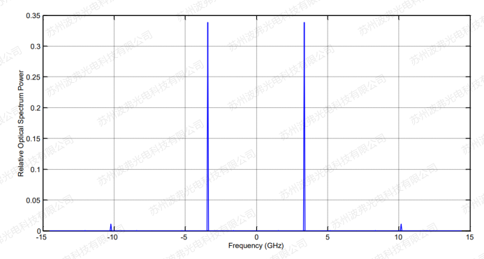 從上圖可以看出,當調制深度為2.4的時候,載波消失,請參考微信文章電光調制器半波電壓隨頻率的變化CS-SSB情況下,下圖為相位調制器輸出光譜的模擬計算結果,載波在”0”所處位置消失,±1階,±2階和±3階邊帶清晰可見,左右對稱分布。