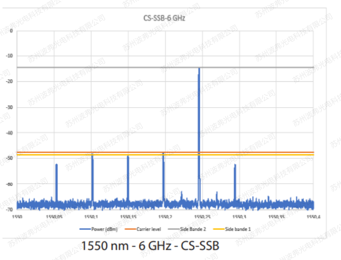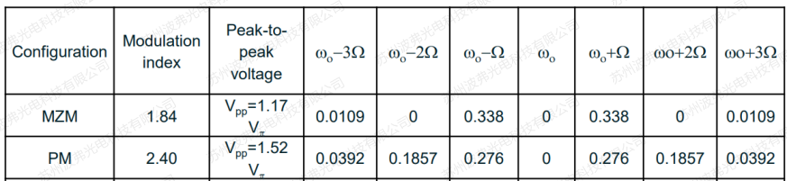 3. 強度調制器所產生的1階邊帶強度高于相位調制器(見下表),因為相位調制器有部分強度分布在其他階邊帶上