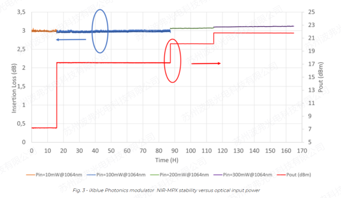 iXblue相位調(diào)制器NIR-MPX為1064 nm近紅外波段開發(fā),得益于對“質(zhì)子退火交換”(APE)波導(dǎo)制造工藝的技術(shù)掌握(也用于我們自己的光纖螺儀中的Y波導(dǎo)),因此,APE波導(dǎo)可以承受幾百毫瓦的光強。