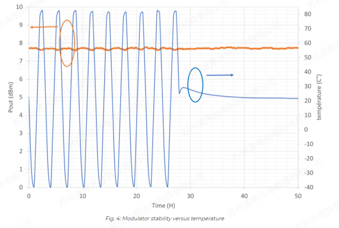由于激光系統(tǒng)可能需要在戶外和具有挑戰(zhàn)性的環(huán)境中工作,因此對調(diào)制器進行了長時間溫度循環(huán)測試。溫度(藍色曲線)從-40°C到+85°C,并記錄輸出功率(橙色曲線)。通過我們的特殊調(diào)制器工藝,調(diào)制器是非常穩(wěn)定的,我們只觀察到在整個溫度范圍內(nèi)0,2dB的微小變化。