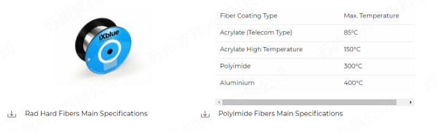 傳感光纖:在一般情況下,標(biāo)準(zhǔn)SMF光纖就足夠了;但溫度超過85度、 光纖的標(biāo)準(zhǔn)涂覆層不能承受如此高的溫度,會熔化。iXblue提供含酰化高溫涂層的光纖最高可達(dá)130°C、 含聚酰亞胺涂層高達(dá)300°C,甚至鋁涂層高達(dá)400°C。在空間或核輻射環(huán)境中,還需要具有抗輻照保證(Radiation Induced Attenuation-RIA)的特定光纖。