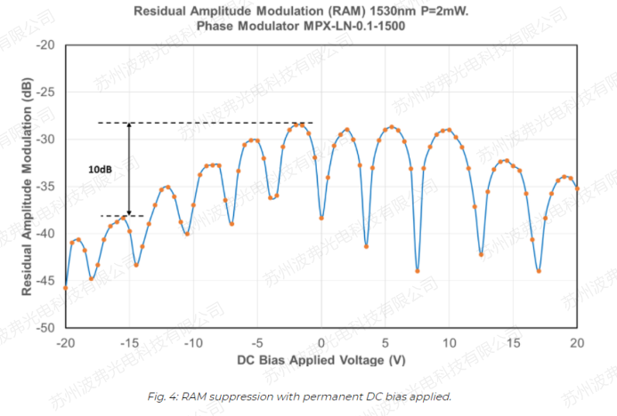 iXblue為PDH設計并優化了專用于減小RAM的低頻相位調制器。RAM可以通過在調制器注入一個直流電壓而降低,該電壓對應于鈮酸鋰波導一個整體的負折射率變化。一個5-15V直流電壓足以將RAM降低>10dB。
