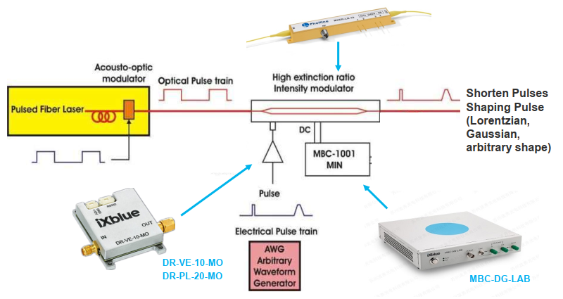 脈沖整形應用,其方案如上圖所示,以脈沖激光器產生的脈沖激光為載波,信號發生器產生電脈沖,經由射頻放大器(DR-VE系列)進行放大,加載到高消光比強度調制器(MXER-LN系列)中,經過電光轉化,電脈沖信號成功加載到載波光信號之上,從而達到脈沖整形的目的。