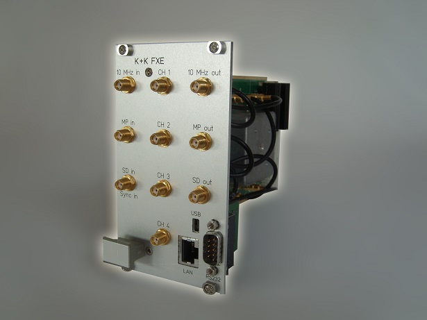 K+K FXE是一種多通道高分辨率相位和頻率計(jì)數(shù)器,它測(cè)量最多24個(gè)通道相對(duì)于公共參考信號(hào)(10MHz)的相位,同步且無停滯時(shí)間。單次測(cè)量的分辨率為12.2ps,輸入頻率范圍為4kHz至130MHz,測(cè)量速率為1k sample/s。