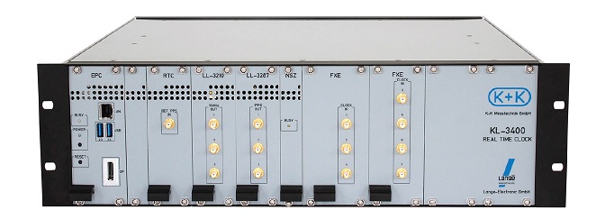 K+K KL-3400實(shí)時(shí)時(shí)鐘的硬件由幾個(gè)板組成,每個(gè)板都有一個(gè)前面板。可選的附加信號(hào)發(fā)生器(如5MHz或100MHz)、分配放大器等完成了畫面。