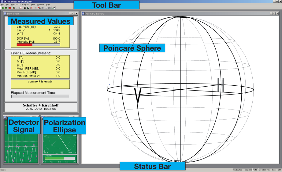 耦合到偏振分析器的輻射在被光電檢測器記錄之前通過旋轉(zhuǎn)的四分之一波片和固定的偏振器。軟件 SKPolarizationAnalyzer 評估從光電二極管信號的詳細分析和四分之一波片的時間/位置信息中檢索到的斯托克斯參數(shù)。然后在龐加萊球上描繪偏振狀態(tài),其中任何偏振狀態(tài)的變化,包括旋轉(zhuǎn)方向(描繪在北半球或南半球)都很容易看到。同時顯示了偏振橢圓,偏振狀態(tài)的常見表示。 對于相干性低的源,DOP 橢圓補充了偏振可視化。