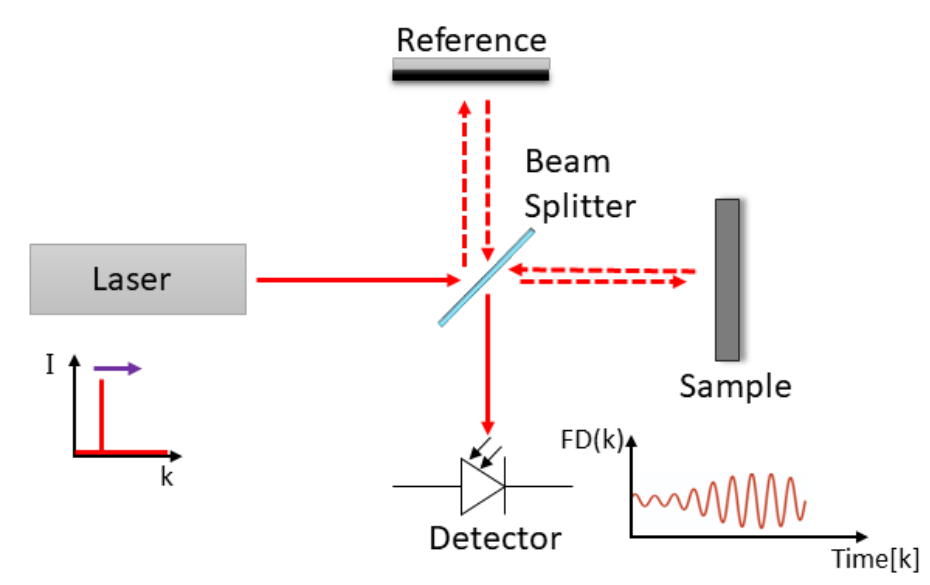 圖1:相干探測示意圖:波長可調(diào)激光器被分割為參考,再次組合的樣本/場景及其與光電探測器的檢測,由數(shù)字化儀和快速傅立葉變換獲取,得出距離(+速度)