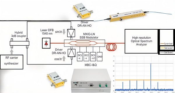 MBC-IQ-LAB是一個能夠在CS-SSB調制方案中控制I&Q調制器的電子系統。它基于最小化兩個小抖動的拍頻諧波。該系統允許在數十小時內保持光學CS-SSB頻譜的諧波抑制優于40dB