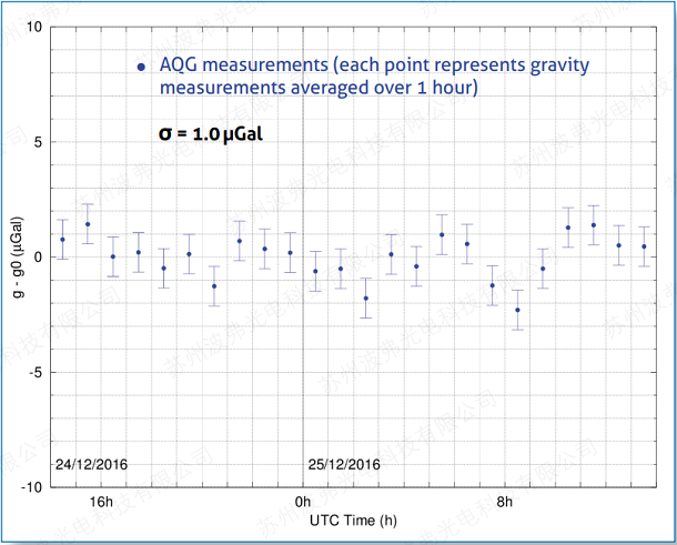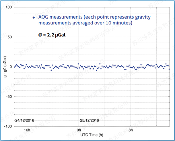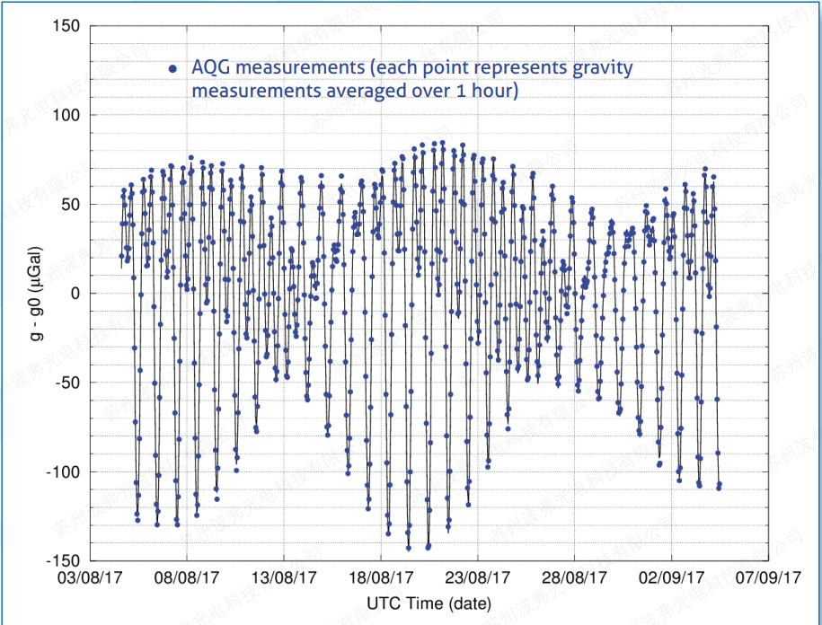 這個不間斷的時間序列已經持續了一個月,并顯示了當地的潮汐。當數據長期平均時持續時間,AQG 提供無漂移的亞 μGal 穩定性。