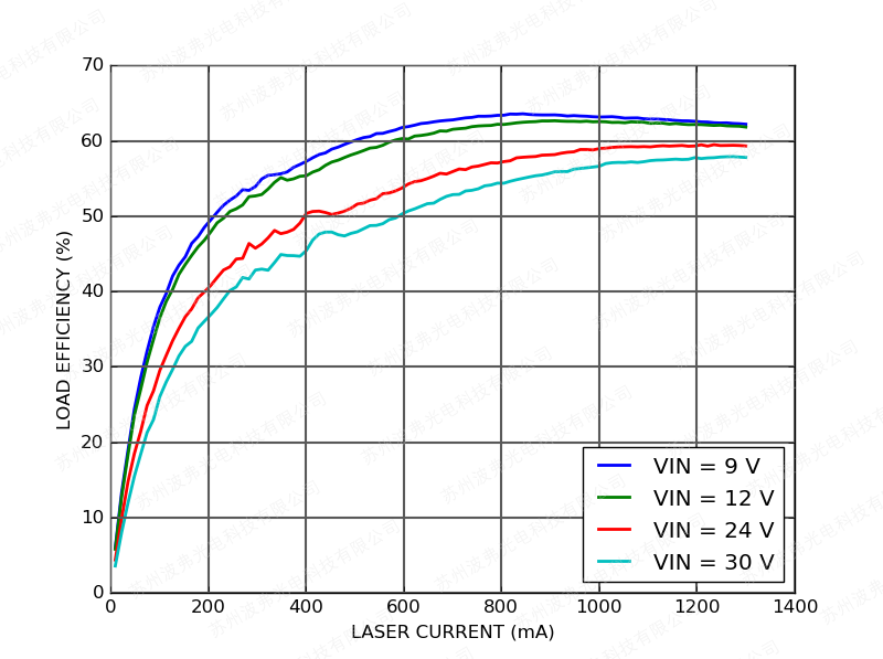下圖顯示了具有200 mV激光驅(qū)動(dòng)器壓降的CTL300E-1-1200控制器的整體負(fù)載效率(=激光電功率/輸入功率)。