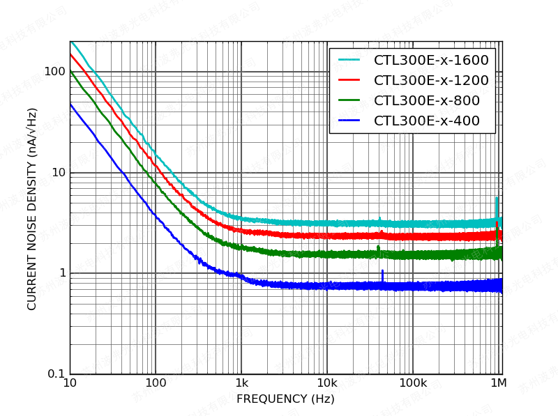 下圖顯示了CTL300E控制器在額定電流和600 mV激光驅(qū)動(dòng)器壓降下工作的電流噪聲密度。