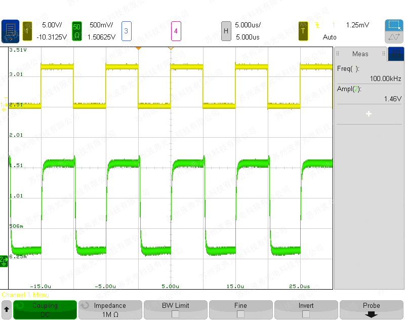 使用具有400 mV激光驅(qū)動(dòng)器壓降的Thorlabs BL976-SAG300泵浦激光二極管在100 mA和600 mA之間切換的示例(黃色:BSEL信號(hào)3.3 V 100 kHz,綠色:激光二極管輸出功率):