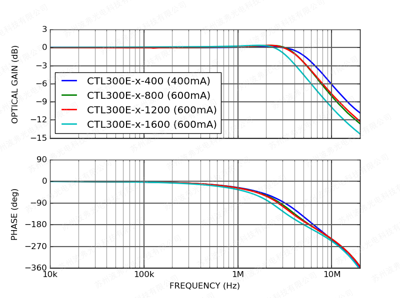 下圖顯示了CTL300E控制器在1 Vpp輸入調(diào)制電壓幅度和400 mV激光驅(qū)動(dòng)器壓降下測(cè)得的調(diào)制頻率響應(yīng)。