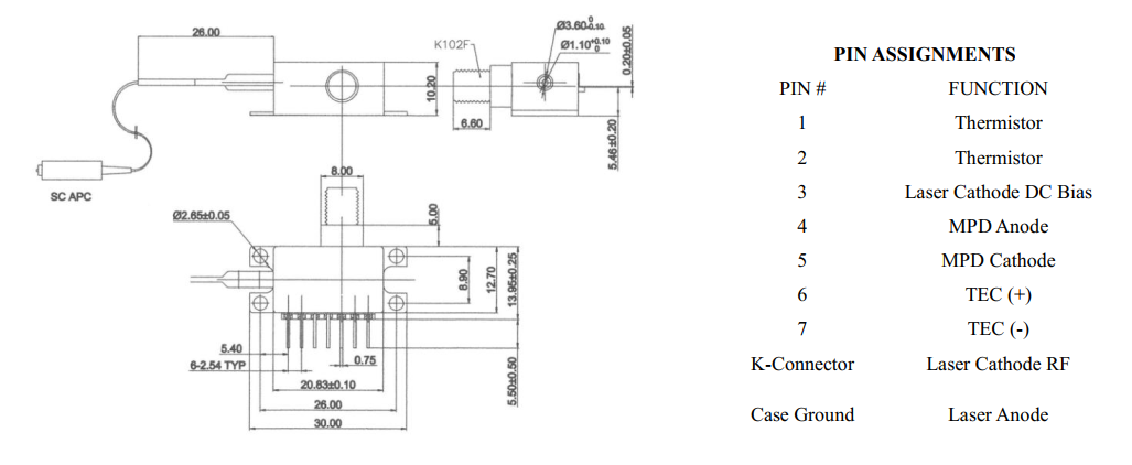 DML系列直接調制激光二極管才有標準單模SMF-28e光纖輸出(可定制保偏尾纖輸出),阻燃涂層,900um套管,標準1m尾纖,5mm PIN腳間隔,已經(jīng)SC/APC接頭(可定制)。